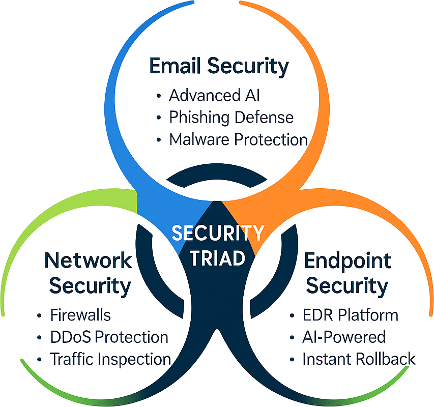 Every Open Door managed services client receives our complete security triad – an integrated, AI-powered defence system that protects your business at every level. Built on enterprise-grade platforms with a Zero Trust-ready architecture, evolve your security at your own pace.